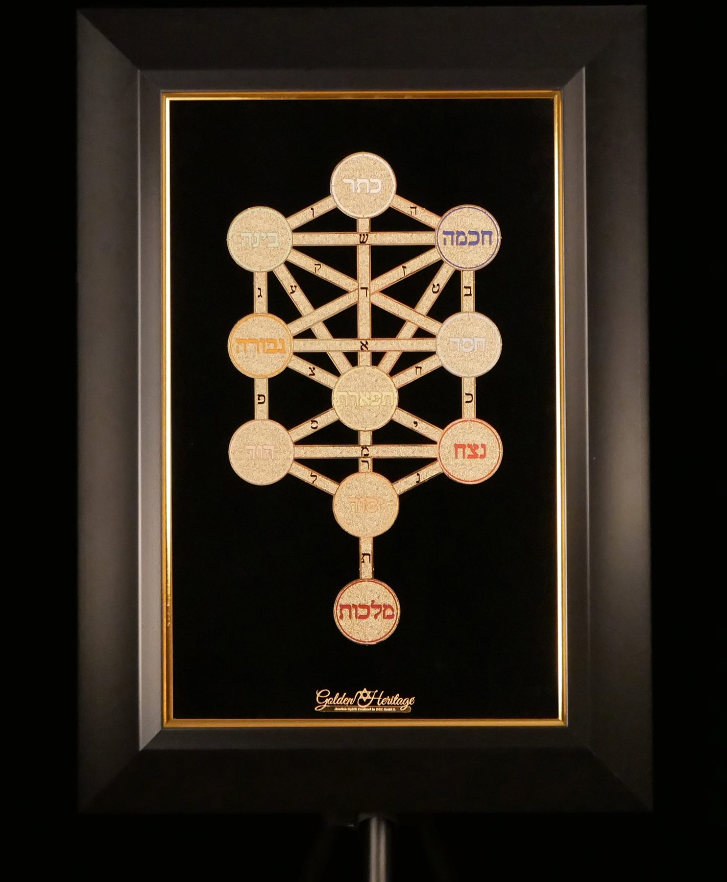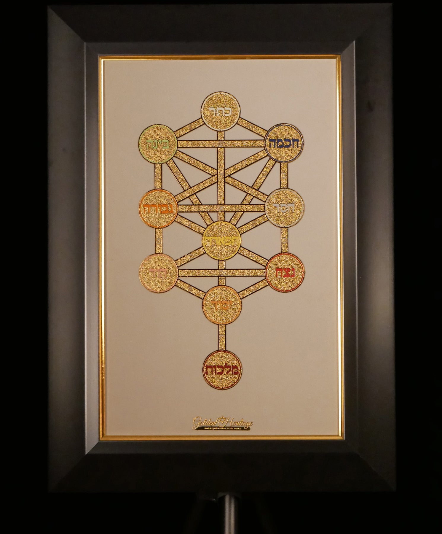Each of the ten Sefirot (divine attributes) is represented by a radiant gold circle, filled with its own unique color, symbolizing its spiritual nature: