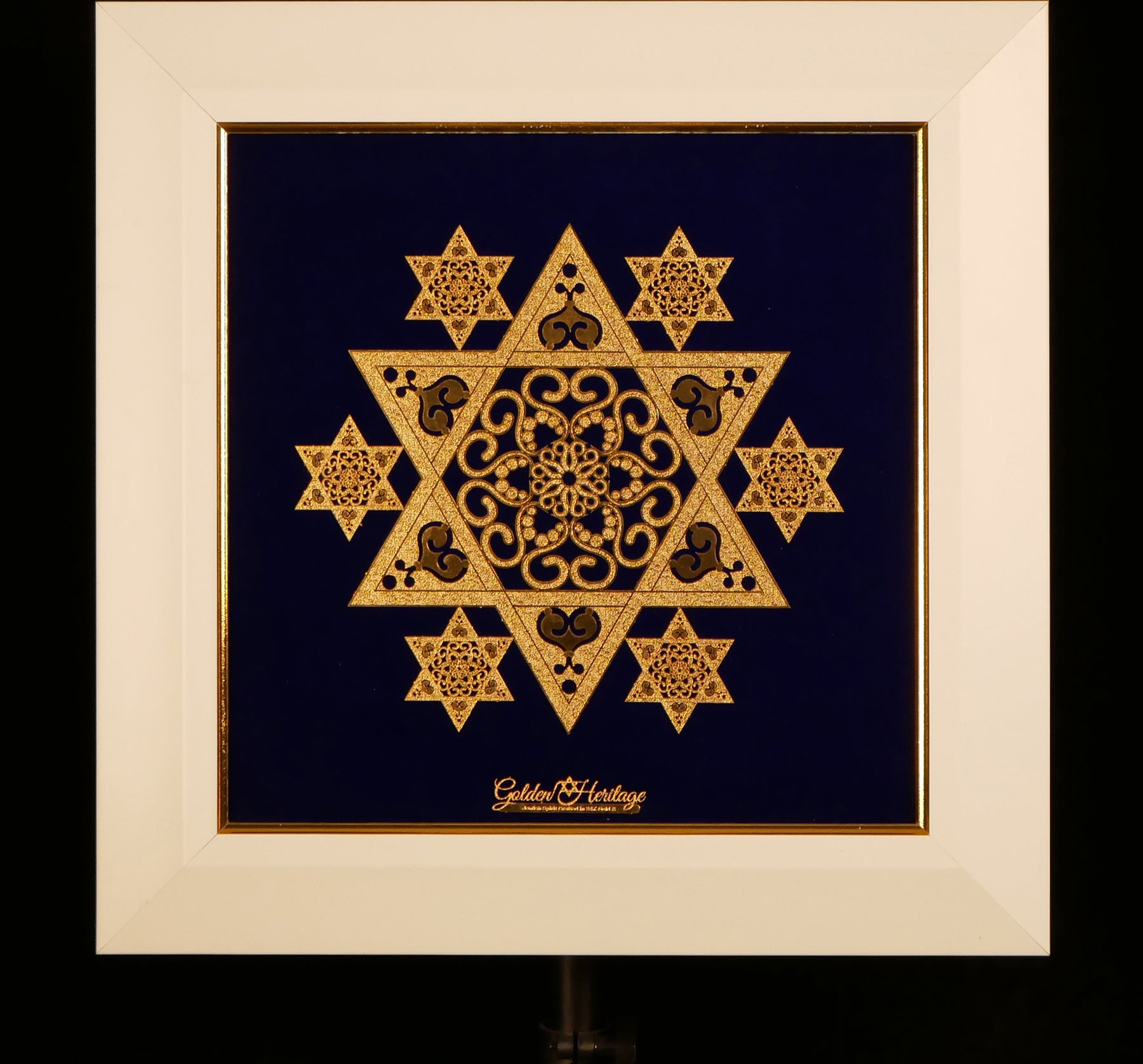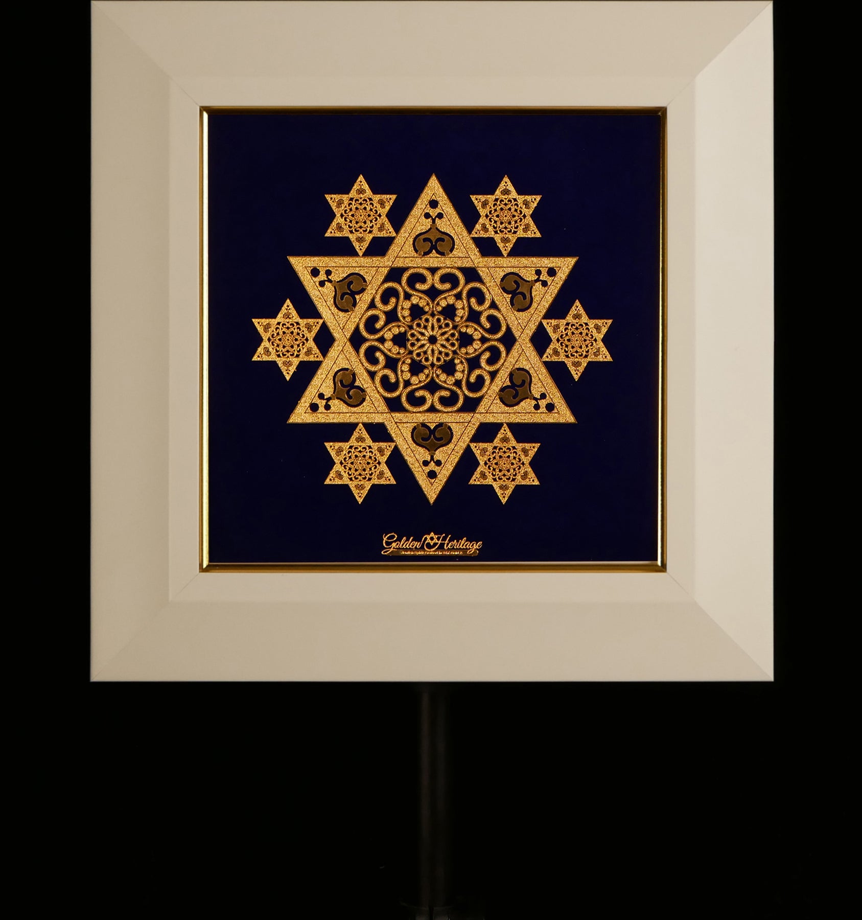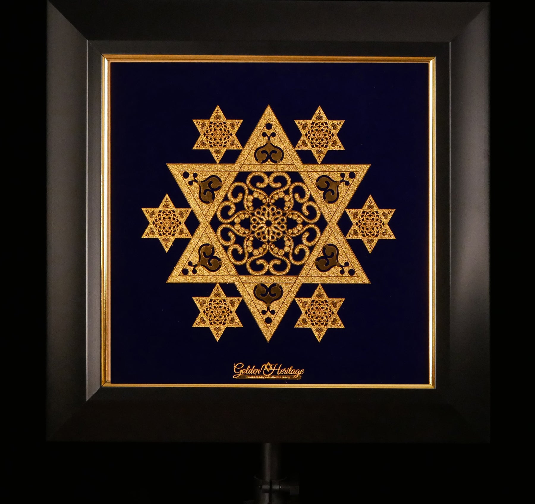 Intricate geometric motifs and flowing lines bring the six-pointed star to life, representing unity, balance, and divine protection. The gold etching glows against a luxurious velvet background, creating depth and movement that capture both tradition and artistry.