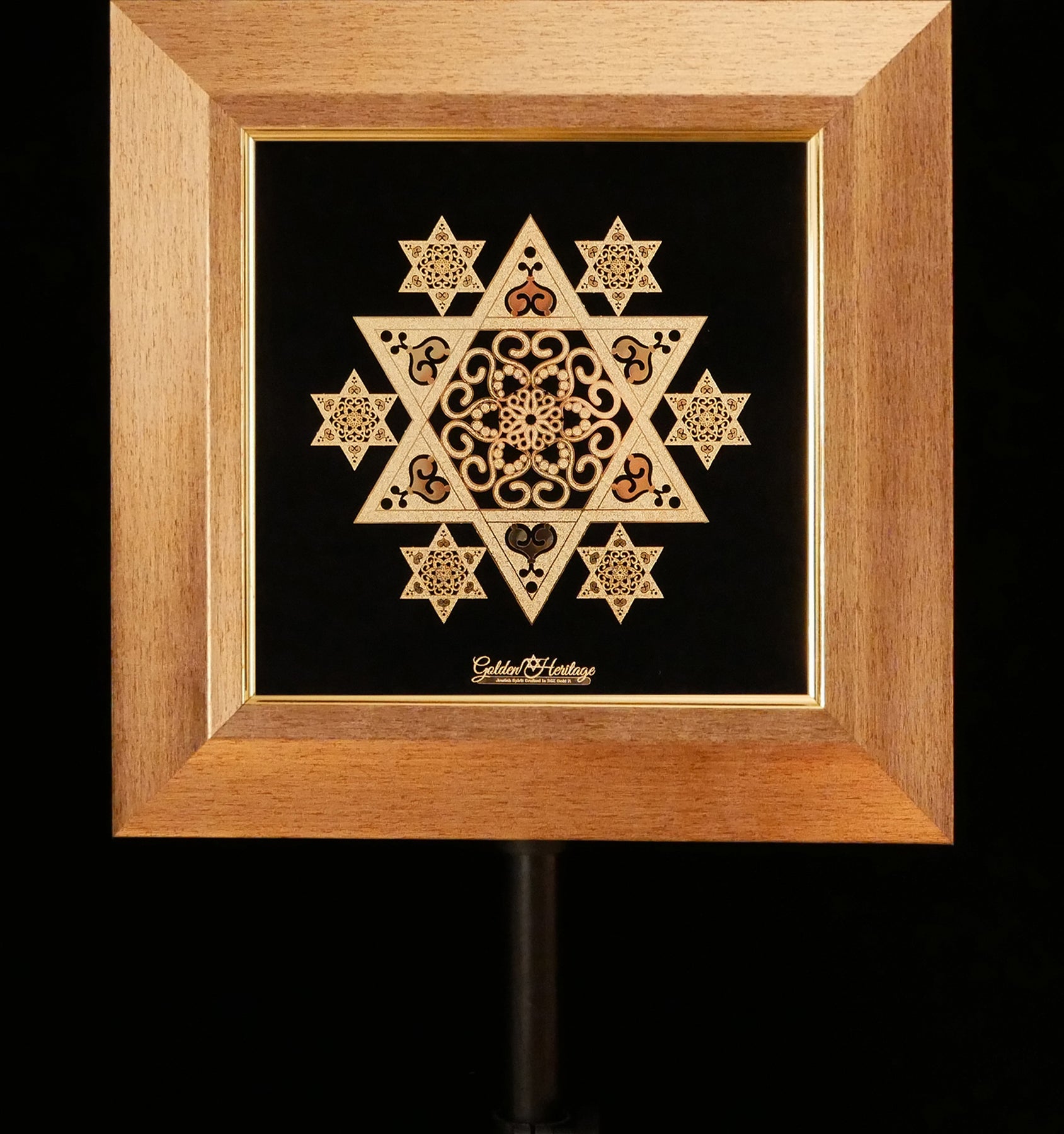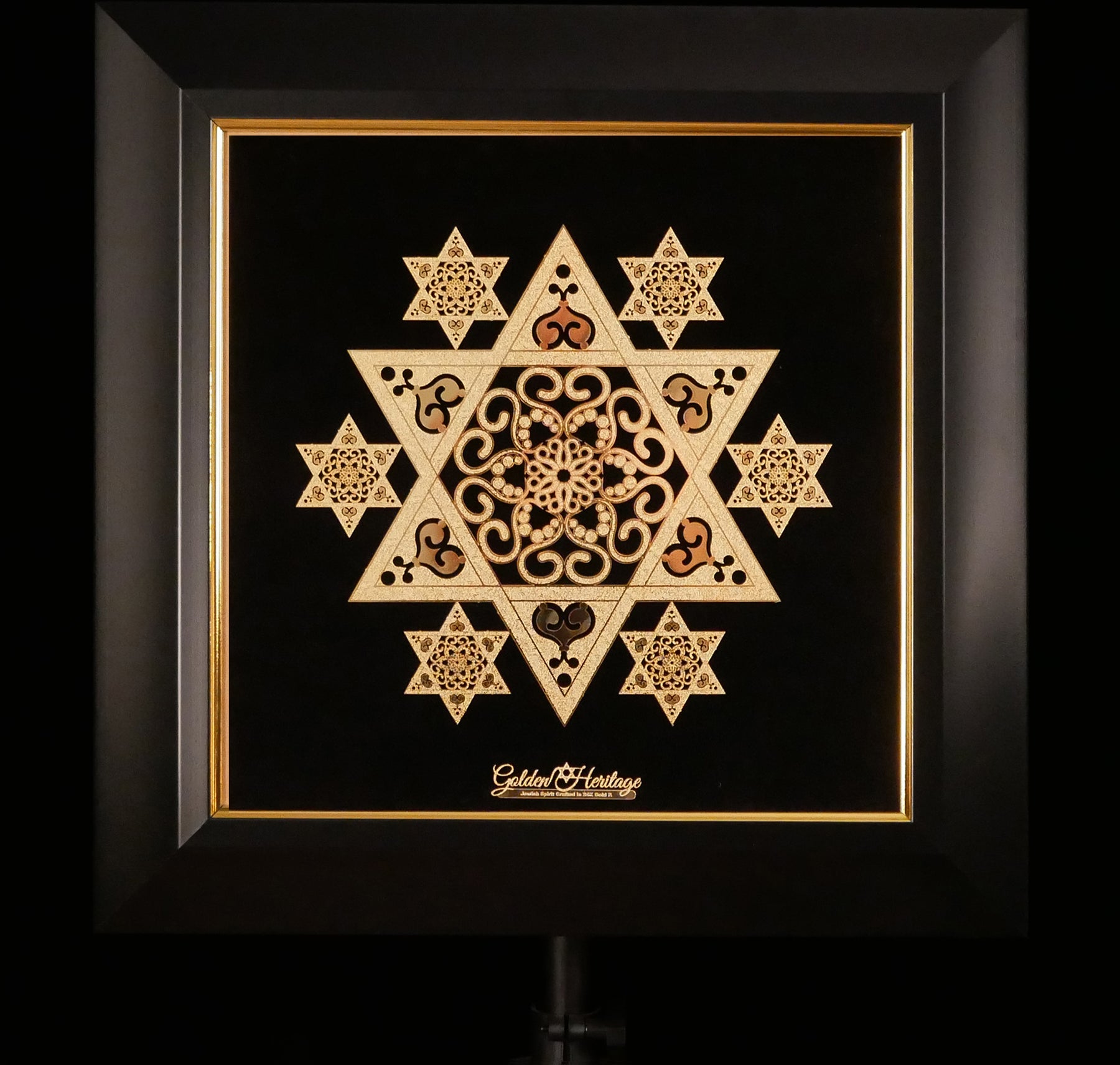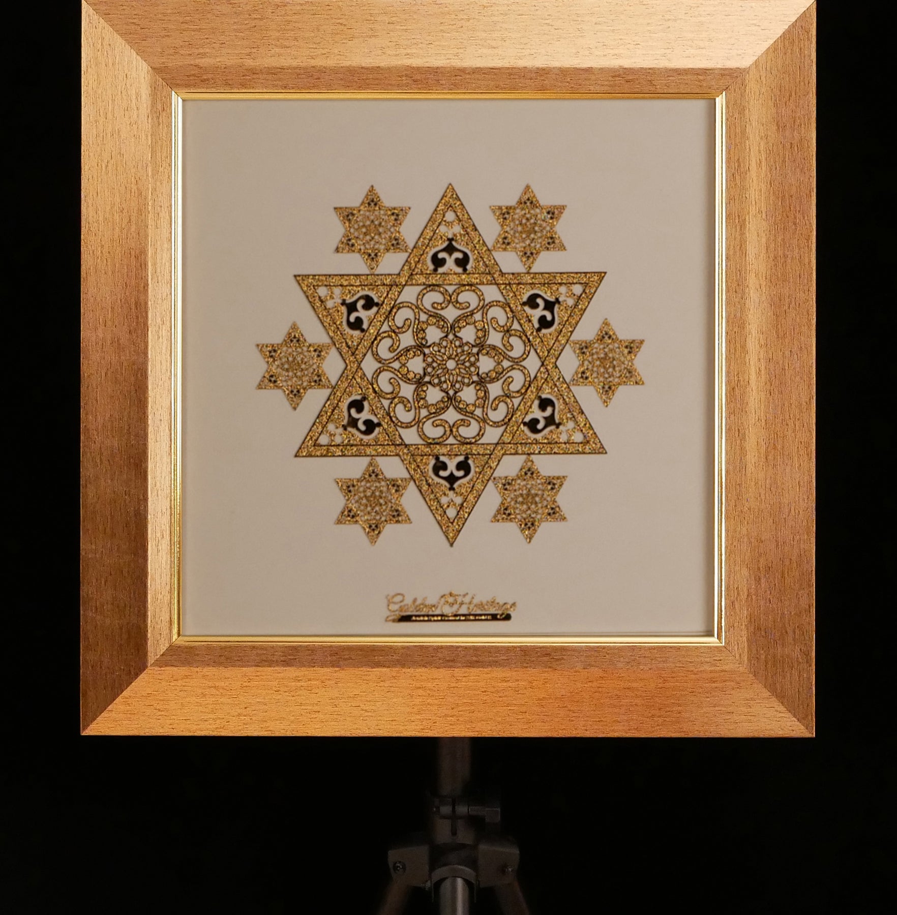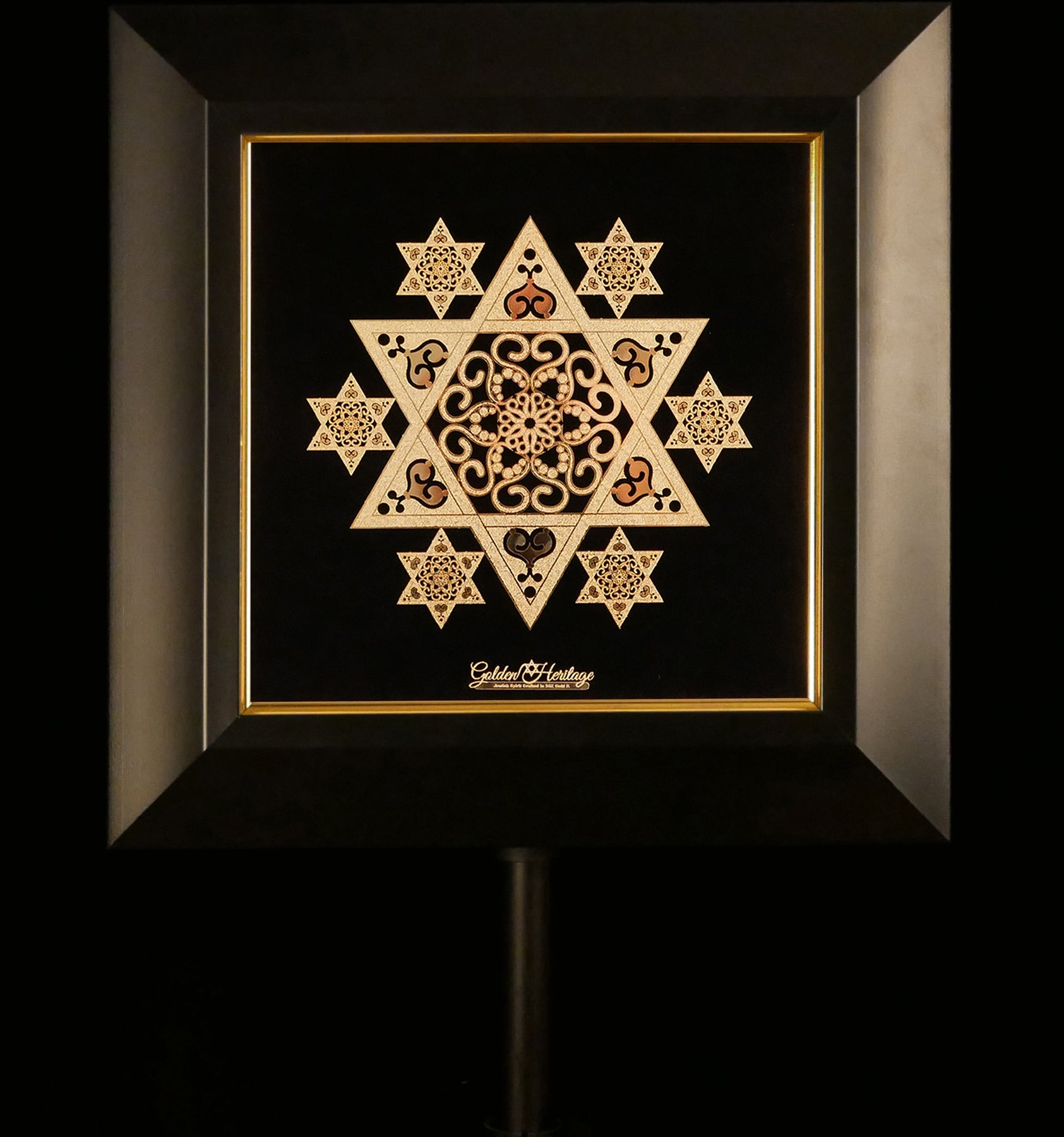 Intricate geometric motifs and flowing lines bring the six-pointed star to life, representing unity, balance, and divine protection. The gold etching glows against a luxurious velvet background, creating depth and movement that capture both tradition and artistry.